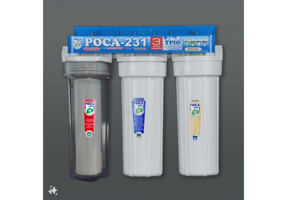 At the first stage, a mechanical cleaning cartridge "РОСА-511" is installed, which removes sand, rust and other mechanical impurities. The second one is a cartridge of pressed coal "ROSA-541" for preliminary absorption cleaning and the third one is a cartridge of final cleaning and softening "ROSA-551" to remove chlorine and its compounds, iron, heavy metals, radionuclides, eliminate foreign tastes and odors, soften water. It is possible to use cartridges for other purposes.
