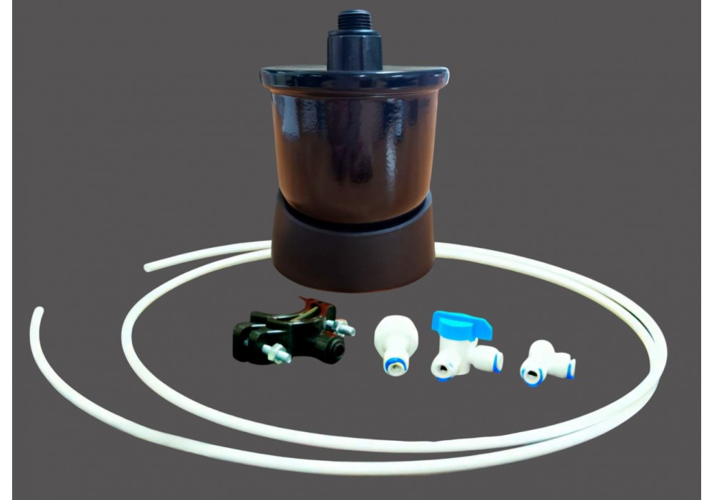 This kit is designed for periodic maintenance of the ultrafiltration membrane in order to extend its service life and maintain high cleaning efficiency, and allows for backwashing of the ultrafiltration membrane in household filters.Purpose:Cleaning the membrane from accumulated micropollutants, colloids, organic particles and biofilm.Restoring filtration performance.Preventing clogging and pressure drop.During system operation, purified water under pressure fills the storage tank. When the tap is switched on, the water from the tank flows in the opposite direction and removes contaminants from the membrane into the drain.Recommendations for use:Backwash every 2–3 months or as needed if there is a noticeable decrease in water flowUse clean water without mechanical impurities for flushingFlushing time: 5–10 minutesComponents of the kit:1. Storage tank 0.13 gallon (11.5x11.5x21.3 cm)2. Three-way valve JG 1/4 inch3. Drain clamp4. 2 m tube5. Fitting 1/2”- JG6. Triple fitting JG..