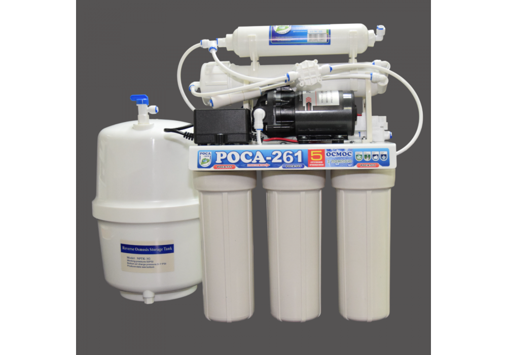 Система обратного осмоса с насосом ROSA 261 – идеальное решение для низкого давления.Если в вашем водопроводе слабое давление или нестабильная подача воды, эта система создана именно для вас.ROSA 261 с насосом обеспечивает стабильную работу и максимальное качество очистки даже в сложных условиях. Максимальная очистка водыСистема обратного осмоса удаляет до 96–99% загрязнений: хлор, тяжелые металлы, бактерии, вирусы, нитраты и соли жесткости.В результате вы получаете безопасную, чистую и вкусную питьевую воду прямо из крана. Встроенный насос – главное преимущество- работает при низком давлении (от 0,5 бар)- стабильная производительность- быстрое наполнение бака- идеально для квартир и домов со слабым напором 5 степеней очистки1. Полипропилен 20 мкм (ROSA 511)Ресурс: до 10000 лЗамена: каждые 3–6 месяцевУдаляет: песок, ржавчину, большие примеси2. Угольный картридж (ROSA 541)Ресурс: до 6000 лЗамена: каждые 3–6 месяцевУдаляет: хлор, запахи, органику3. Полипропилен 5 мкм (ROSA 511)Ресурс: до 10000 лЗамена: каждые 3–6 месяцевФинишная механическая очистка4. Мембрана (ROSA 581 50 галлон)Замена: каждые 1–3 года (зависит от качества входной воды)Основная очистка (до 99% примесей)5. Постфильтр (ROSA 591)Ресурс: до 6000 лЗамена: каждые 6 месяцевУлучшает вкус воды Когда нужно менять картриджи?Обратите внимание на эти признаки:- уменьшился напор воды из крана- вода стала хуже на вкус или появился запах- Бак набирается гораздо дольше- манометр показывает падение давления в системе- Прошло больше 6 месяцев с момента замены Даже если вода выглядит чистой – картриджи могут быть уже перегружены.Своевременная замена – это защита мембраны и экономия ваших средств. Комплектация- фильтр с насосом- комплект картриджей- Мембрана- постфильтр- накопительный бак- Кран- трубки и фитинги Основные характеристики:Тип: обратный осмос (5 ступеней)Колбы: стандарт 10"Производительность: до 180 л/суткиРабочее давление: до 6 барТемпература: до 40°CМонтаж: под мойкойПочему стоит выбрать ROSA 261?- работает там, где другие не работают- стабильное качество воды- защита от накипи- простое обслуживание- готов к установке..