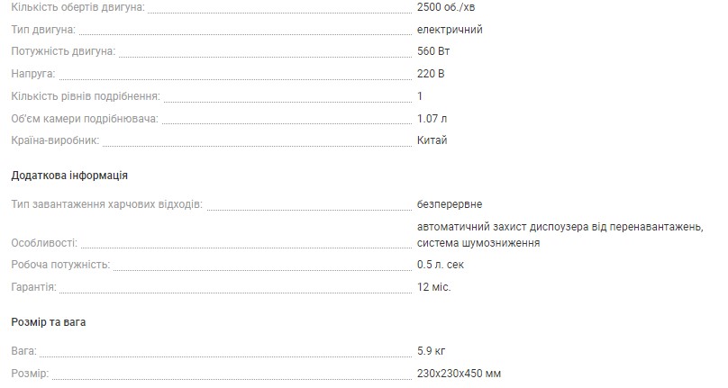 Ви пам'ятаєте як смердять сміттєвози у період кавунів та динь? Як часто Ви виносите сміття, а за пакетом тягнеться мокрий шлейф? Перестаньте викидати харчові відходи у сміттєву корзину, використовуйте подрібнювач. Отвір діаметром 80 міліметрів і потужний двигун дозволить Вам відправити в каналізацію і лушпайки картоплі, і скоринку кавуна, і курячі кістки. Звільніть кухню від харчових відходів!!! Всі подрібнювачі Роса обладнані пневматичною кнопкою, котра виводиться на поверхню мийки чи стільниці. Таке рішення є найбільш безпечним і гарантує повний захист від можливого ураження струмом. Характеристики: Потужність - 3/4КС або 560Вт ..