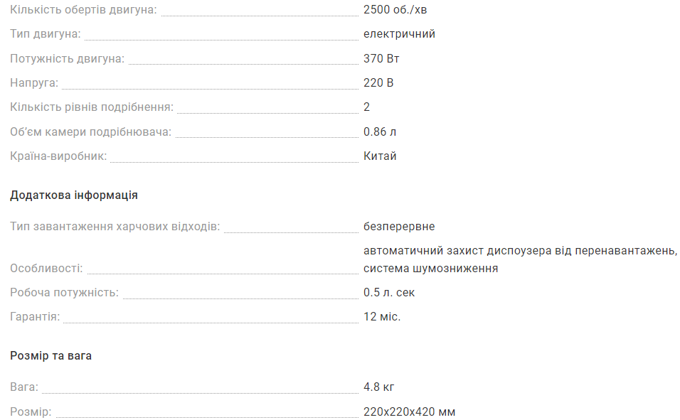 Ви пам'ятаєте як смердять сміттєвози у період кавунів та динь? Як часто Ви виносите сміття, а за пакетом тягнеться мокрий шлейф? Перестаньте викидати харчові відходи у сміттєву корзину, використовуйте подрібнювач. Отвір діаметром 80 міліметрів і потужний двигун дозволить Вам відправити в каналізацію і лушпайки картоплі, і скоринку кавуна, і курячі кістки. Звільніть кухню від харчових відходів!!! Всі подрібнювачі Роса обладнані пневматичною кнопкою, котра виводиться на поверхню мийки чи стільниці. Таке рішення є найбільш безпечним і гарантує повний захист від можливого ураження струмом. Характеристики: Потужність - 1/2КС або 370Вт..